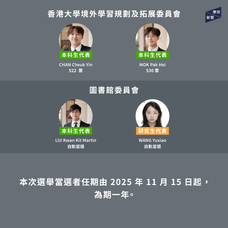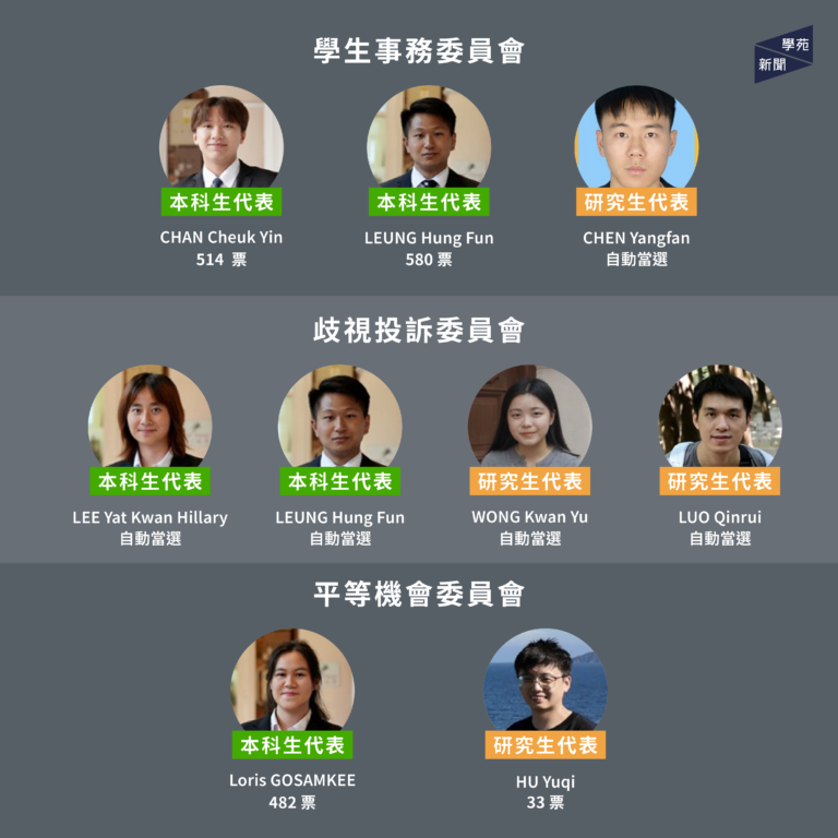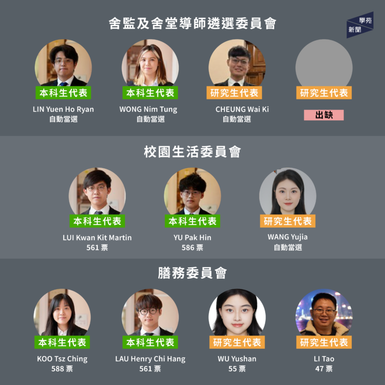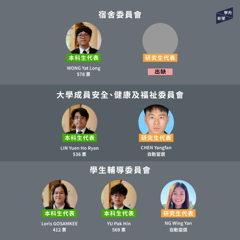 【學苑新聞】大學管治委員會投票於 11 月 6 日結束,學生發展及資源中心(CEDARS)今(11 月 10 日)公佈選舉結果。本科生代表中,10 個委員會共 16 個本科生席位皆由聯合競選平台「篤行致遠」參選人各以 500 餘票當選 ,自動當選的 5 席亦同屬該競選平台。「篤行致遠」參選人全取 21 個本科生席位,情況與過去兩年相同。研究生代表中,膳務委員會兩席由 WU Yushan 及 LI Tao 分別以 55 及 47 票當選;平等機會委員會一席由 HU Yuqi 以 33 票當選。